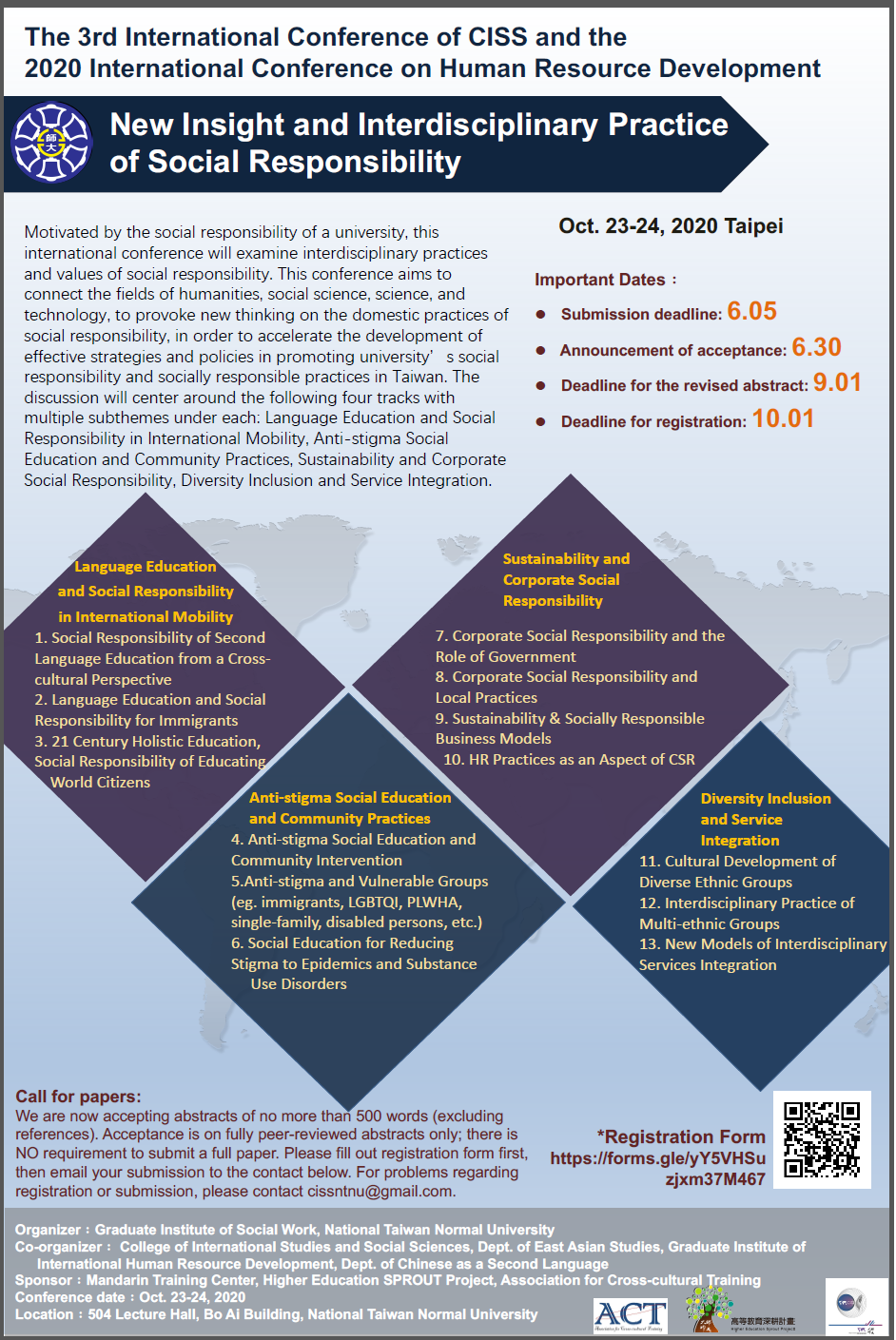 *註:投稿者請先報名,並將論文摘要,中英文皆可,中文約800字,英文約500字,以Word檔及PDF檔email至<cissntnu@gmail.com>國社院劉姵君專員,並請於email中註明中英姓名、服務單位(