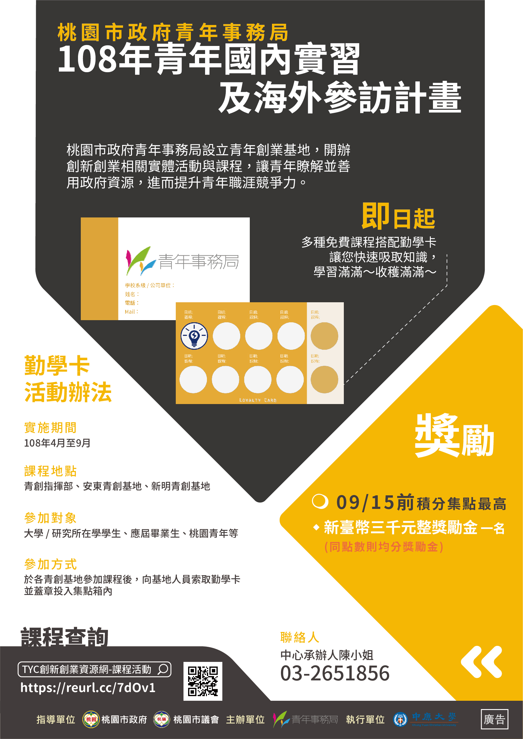 桃園市政府青年事務局所轄三處青年創業基地(青創指揮部、安東青年創業基地及新明青年創業基地),開辦多種免費主題式課程、創客課程及創業研習班,並搭配旨揭勤學卡活動,歡迎貴校學子踴躍參與,提升創新創業知能(課程查詢請詳「TYC創新創業資源網」,網址:https://tyc.tycg.gov.tw/)。
