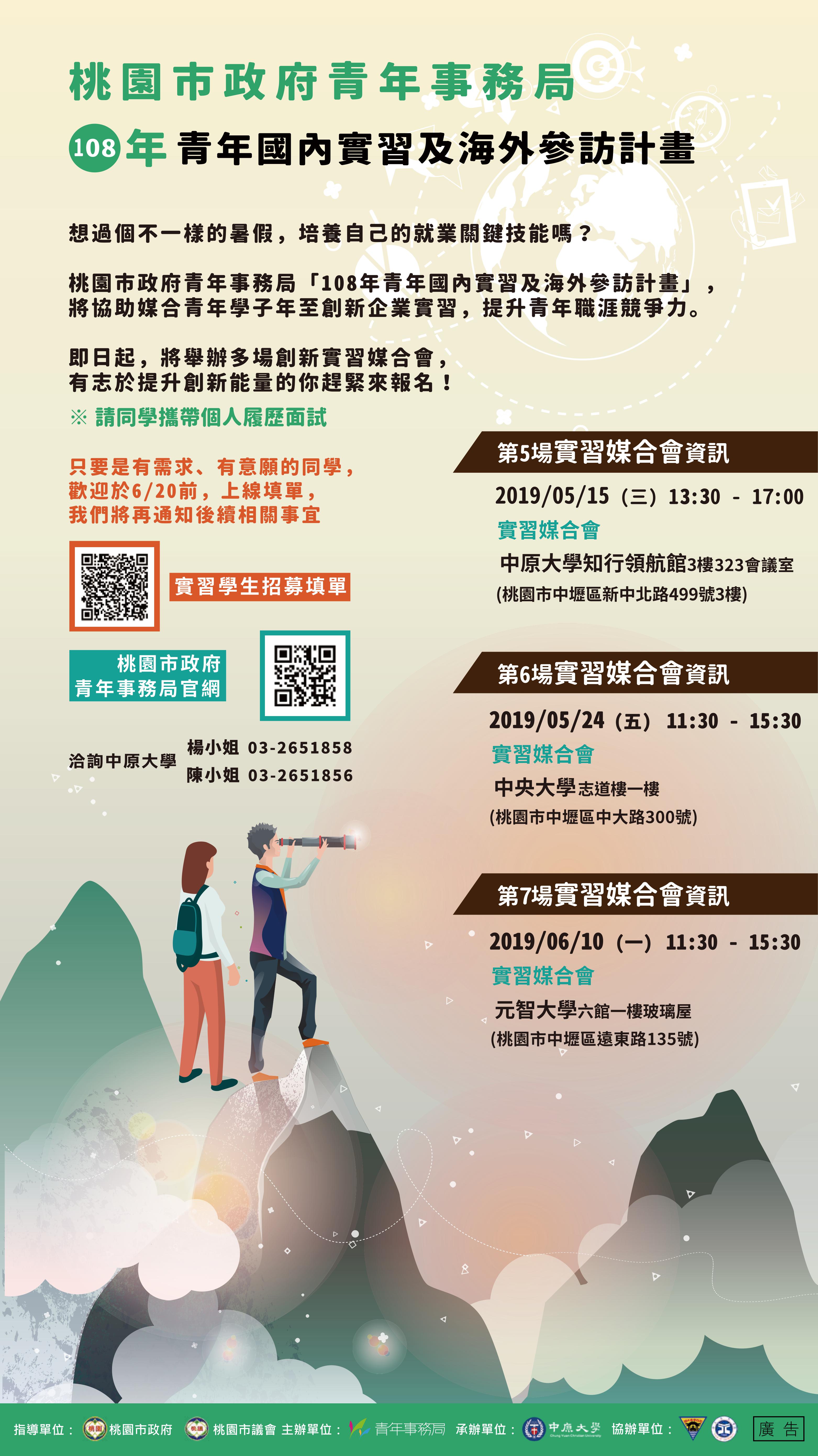 本年度將陸續辦理數場實習媒合會,第5、6、7場預計於本年5月15日於中原大學、5月24日於中央大學及6月10日於元智大學辦理,歡迎同學們踴躍參與(報名網址:http://tinyurl.com/y366ssy9,亦開放青年現場攜帶個人履歷報名;詳情請至桃園市政府青年事務局官網/訊息公告/最新消息項下查詢)。